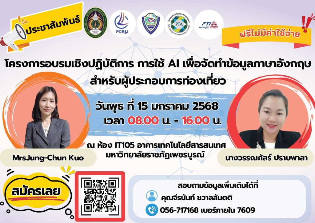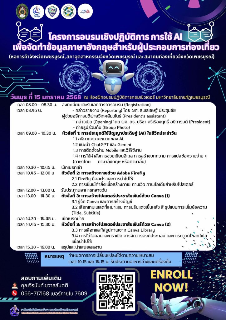 จัดอบรมในวันพุธที่ 15 มกราคม 2568 เวลา 08.00 – 16.00 น. ณ ห้อง IT105 อาคารเทคโนโลยีสารสนเทศ มหาวิทยาลัยราชภัฏเพชรบูรณ์