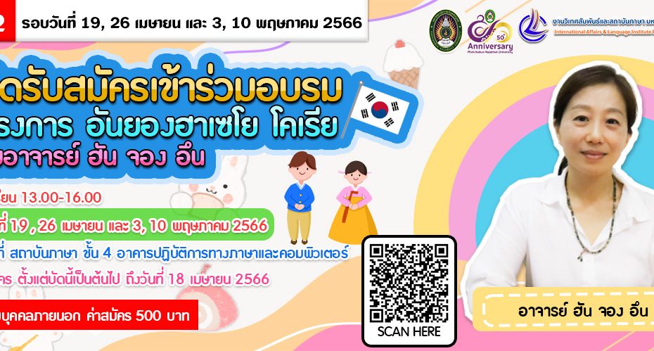ระยะเวลา 12 ชั่วโมง ( 4 ครั้งๆ ละ 3 ชั่วโมง) เวลาเรียน 13.00-16.00 ในวันพุธที่ 19, 26 เมษายน และ 3, 10 พฤษภาคม 2566 สถานที่ สถาบันภาษา ชั้น 4 อาคารปฏิบัติการทางภาษาและคอมพิวเตอร์… Read More »เปิดอบรมโครงการ อันนยองฮาเซโย โคเรีย (ครั้งที่ 2)